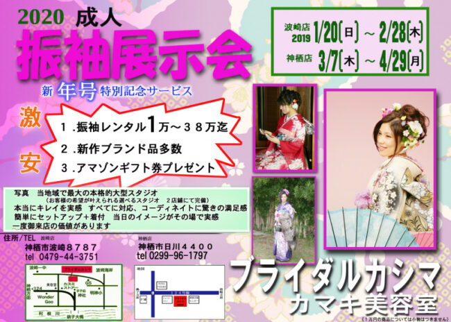 2019年 成人振袖開催いたします!! 1/20(日)~2/28(木) 波崎店 3/7(木)~4/29(月) 神栖店 成人振袖レンタル 1万円~ 新作、ブランド品多数取り揃えてあります。