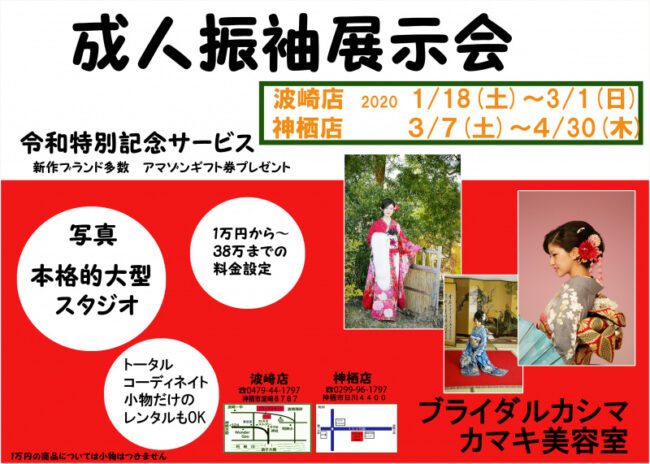 2020年 成人振袖展示会を開催いたします!! 1/18(土)~3/1(日) 波崎店 3/7(土)~4/30(木) 神栖店 成人振袖レンタル 1万円~ 新作、ブランド品多数取り揃えてあります。