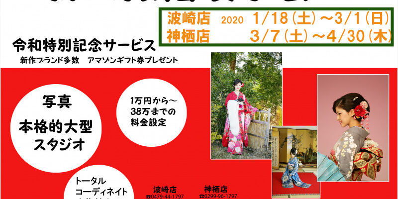 1月182020イベント情報新着情報2020年 成人振袖展示会を開催いたします!! 1/18(土)~3/1(日) 波崎店 3/7(土)~4/30(木) 神栖店 成人振袖レンタル 1万円~ 新作、ブランド品多数取り揃えてあります。 Post navigationPreviousPrevious post:2019年 成人式振袖展示会を開催いたします!!【アマゾンギフト券プレゼント】NextNext post:ワンちゃんフォトはじめました。 愛犬のアルバム、写真立て、グッズ等作成承ります!!