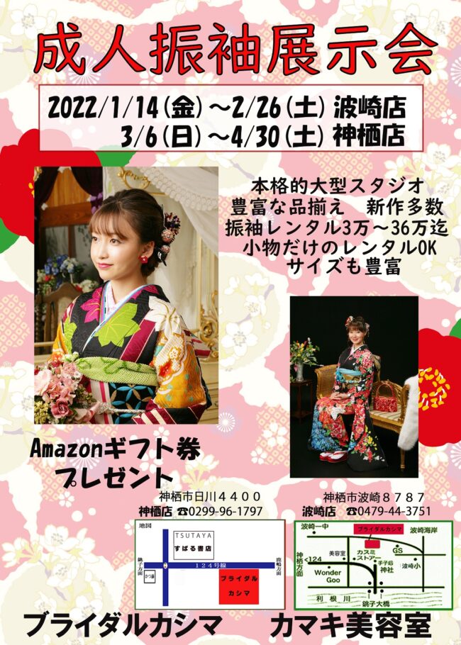 2022年 成人振袖展示会を開催いたします!! 1/14(金)~2/26(土) 波崎店 3/6(日)~4/30(土) 神栖店 成人振袖レンタル豊富に品揃えあります 是非ご来店お待ちしております。
